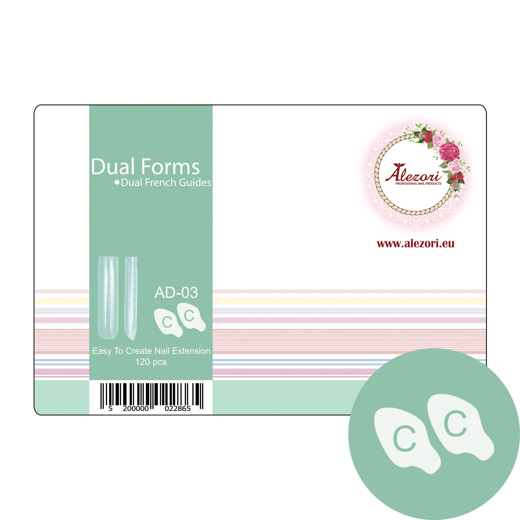 Η ALEZORI σας παρουσιάζει κορυφαίες φόρμες με σκοπό η διαδικασία μοντελοποίησης να είναι πολύ εύκολη και γρήγορη για εσάς! Χάρη στην ειδική χημική σύνθεση το Dual Form διαχωρίζεται με ακρίβεια και ευκολία απο το gel ή άλλο υλικό χτυσίματος νυχιών. Σας παρέχει πάντα ομαλή επιφάνεια. Μπορείτε να δημιουργήσετε, σε κάθε τύπο χεριού, άψογα σετ με την βοήθεια του Dual Form ALEZORI. Ενδείκνυται για γαλλικό!